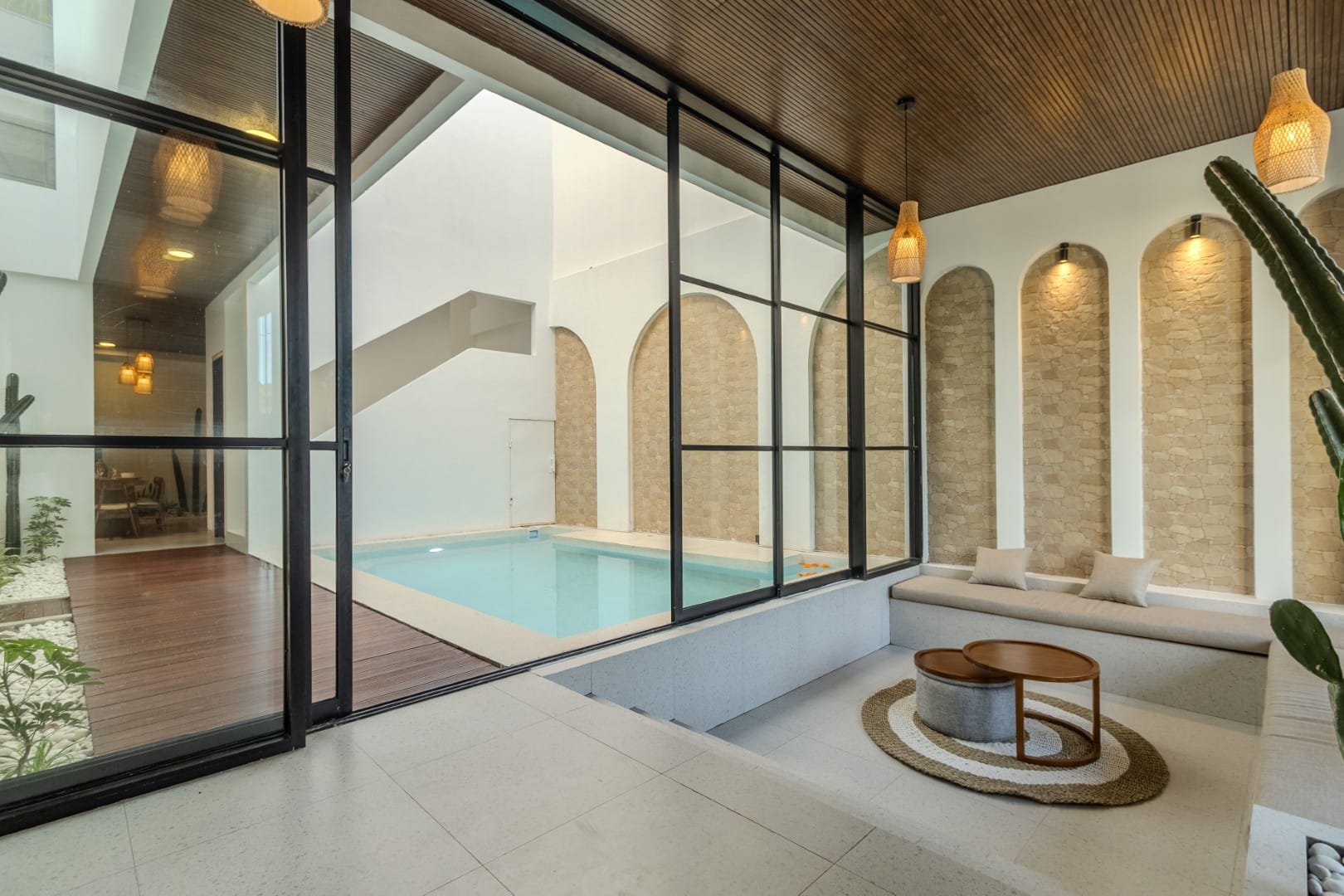 From the moment you step in, you’re greeted by a bright open courtyard with a private pool, framed by natural stone walls and soaring ceilings. Sunlight dances through the space, giving every corner a soft, serene glow.
